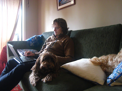 Buffy likes to burrow into the cushions – as captured below. The girls liked to cuddle up to their dad as well. Alec calls them “stalker dogs” because they don’t like us to be out of their sight. If I get off the couch to go to the kitchen, I turn around and there is one or both of them, at my heels looking up expectantly. Somewhat disturbing, somewhat cute. It’s hard to decide.